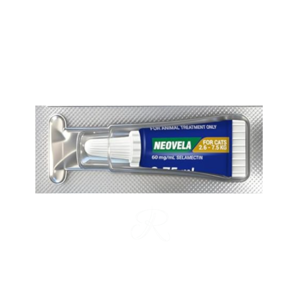 المكونات النشطة: سيليمكتين 60 مجم / مل يعالج القطط: 2.6 - 7.5 كجم (5.7 - 16.5 رطل) نيوفيلا علاج موضعي شهري مناسب للقطط والقطط. التركيبة المتطابقة (سيلامكتين) لـ Neovela تجعلها بديلاً ميسور التكلفة للقطط Revolution. يستخدم للوقاية من البراغيث والعث والديدان المعوية مثل الديدان الخطافية والديدان القلبية ومكافحتها. كما أنه يقي القطط من عث الأذن والقمل والتهاب الجلد الناتج عن الحساسية من البراغيث. علاوة على ذلك ، فهو علاج مضاد للماء ، لذلك لا توجد فرص لغسل المحلول إذا لامست قطتك الماء. يمكن أيضًا استخدام Neovela للقطط على الأرانب. يعالج عث الأذن والجرب القارمي وداء الخيطيات (Cheyletiella sp.) في الأرانب. كيف يعمل؟ Neovela هو علاج موضعي للبراغيث والديدان والديدان القلبية للقطط والقطط. عندما تقوم بتطبيقه على قطتك ، فإن سيلامكتين الموجود فيه يخترق جلدهم ويدخل مجرى الدم. سيلامكتين الموجود في مجرى الدم والأنسجة يمنع الديدان القلبية. يقتل سيلامكتين الذي يتم توزيعه في الجلد من مجرى الدم البراغيث وبيض البراغيث ويرقات البراغيث وطفيليات القطط الخارجية الأخرى. سيلامكتين هو أيضًا مضاد للديدان ، لذا فهو يعالج الديدان المعوية مثل الديدان الخطافية والديدان المستديرة ويتحكم فيها أيضًا. قم بإزالة الأنبوب من الصندوق. لف الغطاء عن طريق تقشير قفل الحلقة ، مع الإمساك به في وضع رأسي. افصل شعر القطة من مؤخرة رقبتها حتى يصبح الجلد مرئيًا. أفرغ محتويات الأنبوب الموجود في مؤخرة عنق القط. المنتج مقاوم للماء بعد ساعتين من التطبيق. علاج موضعي سهل الاستخدام لطفيليات القطط الداخلية والخارجية يقتل البراغيث البالغة وبيض البراغيث ويرقات البراغيث ويتحكم فيها. يصبح القمل اللاذع مقاومًا للماء بعد ساعتين من الاستخدام