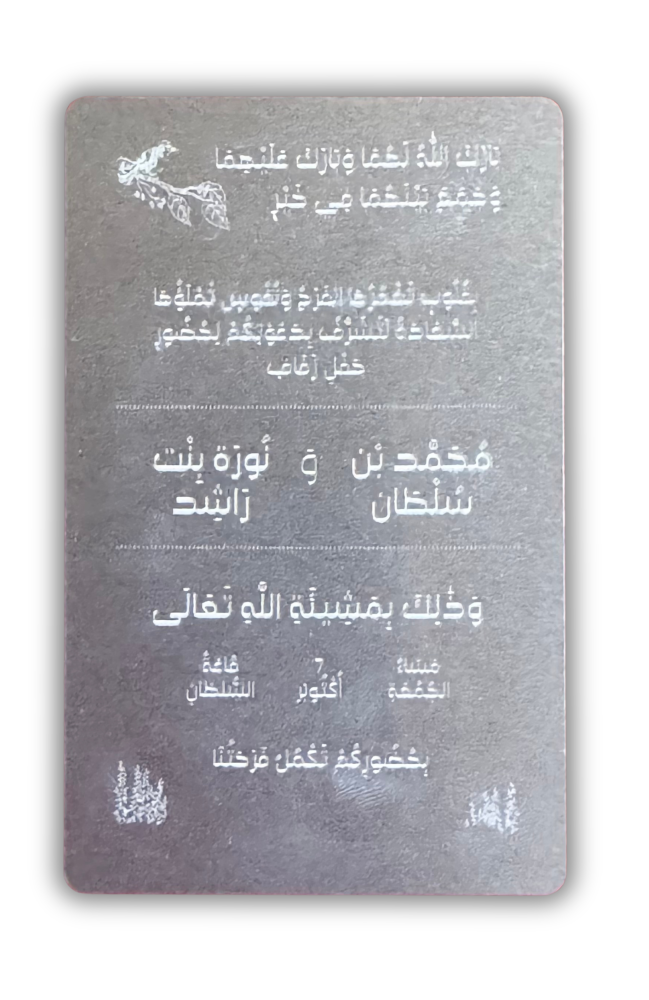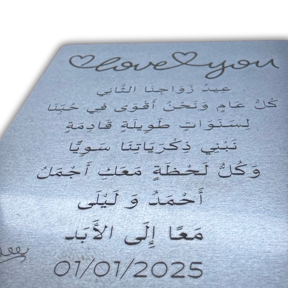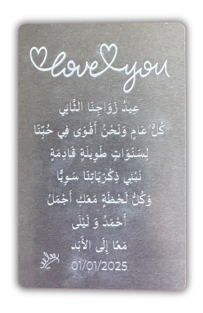 Custom metal business card sized keepsake and gift engraving piece that allows you to create your own personalized designs with precise laser engraving. Perfect for special gifts, keepsakes and occasions such as wedding anniversaries, births and more.